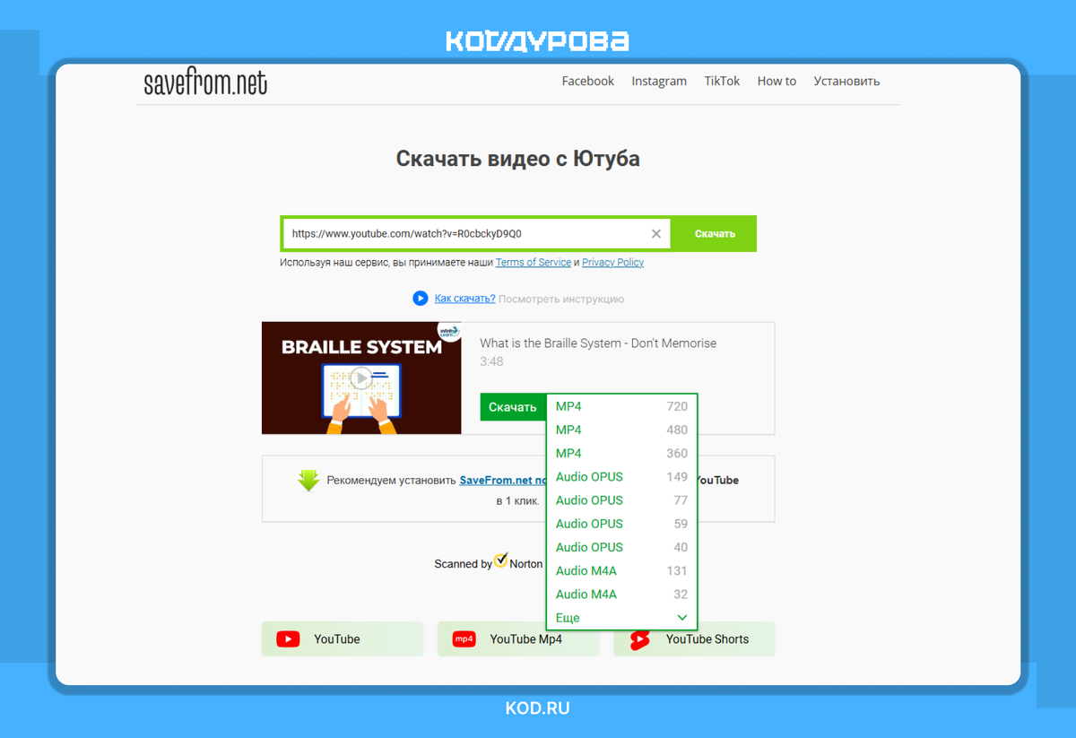 - Выберите формат (MP4, WEBM, MP3) и качество (360p, 720p, 1080p).