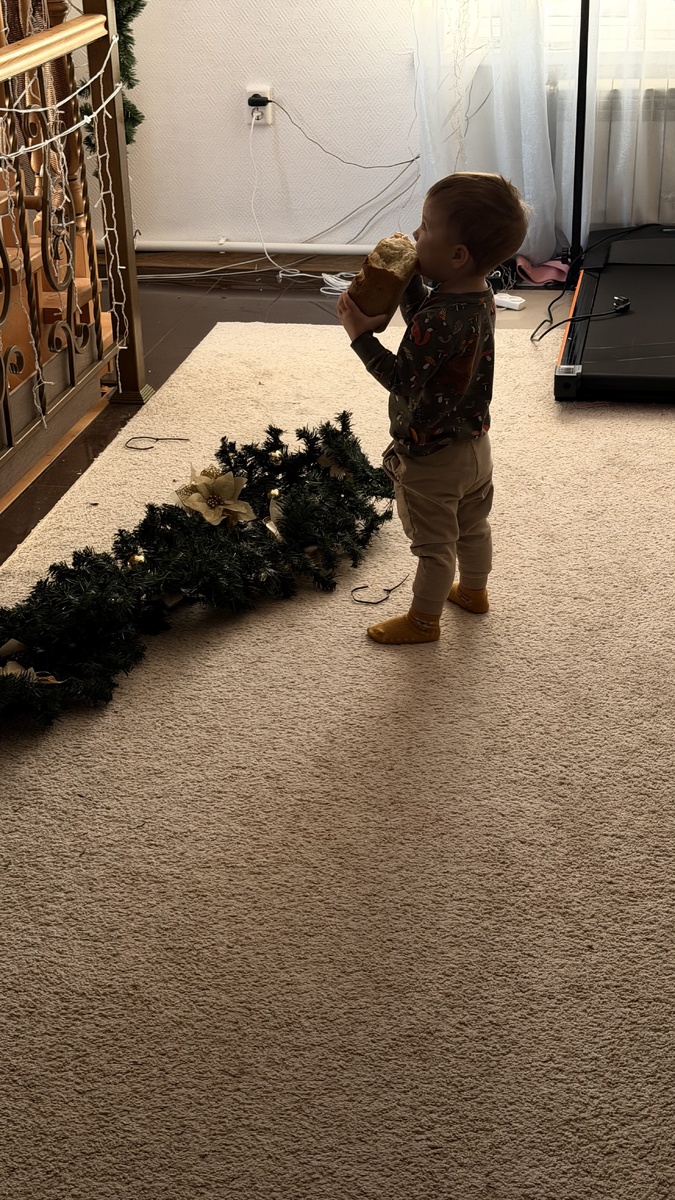 С кухни ёлку убрали, там освободился целый угол здоровый, ну я решила организовать в нём поздравительную фотозону. Припёрла своё светящееся дерево, вокруг шары расставила…с ёлкой, конечно, было наряднее и красивее, но и такой вариант оформления оказался неплох.