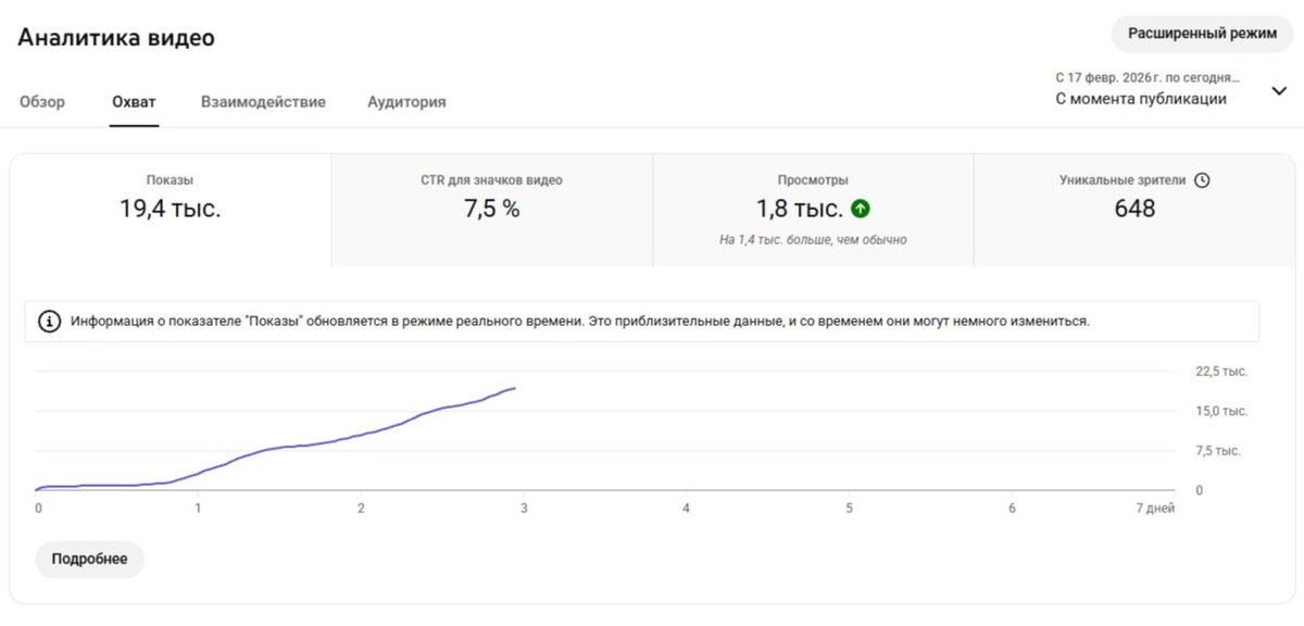 Всем привет! Ютуб меня с последним моим видео прям пнул вверх и дал уже почти 20к показов при том, что его посмотрели уже больше 1.7к людей