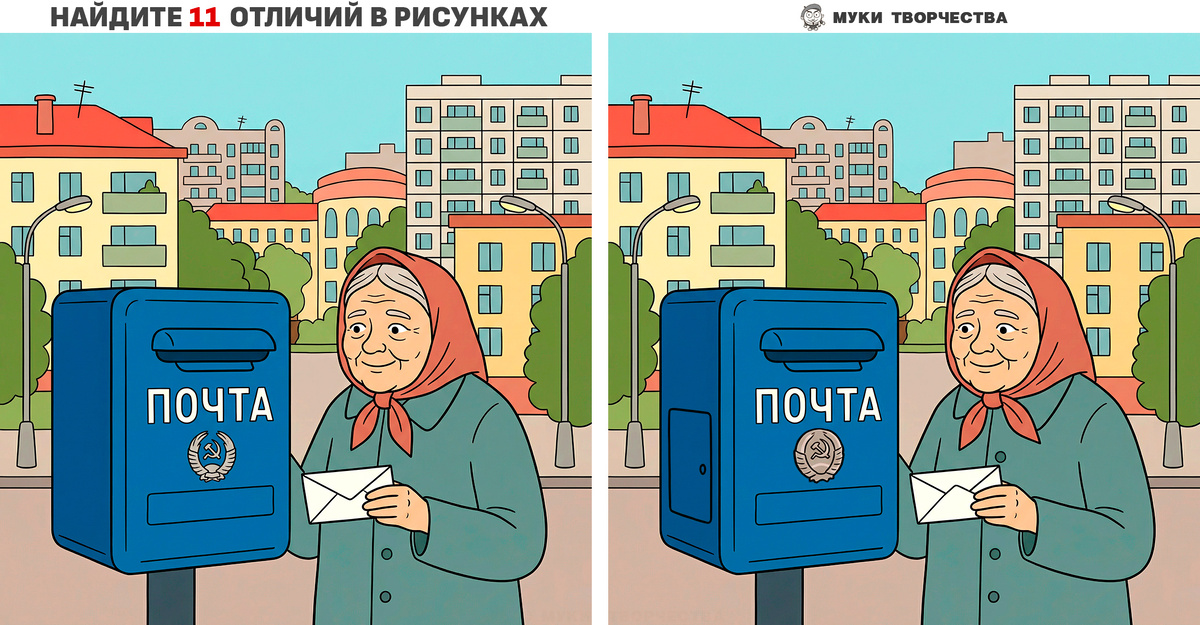 Добрый день друзья! Сегодня задачка на внимание с ностальгическим настроением. Перед вами две картинки с бабулей отсылающей письмо по почте. Картинки сильно похожи. Но в одной художник спрятал 11-ть отличий. Отыщите все различия самостоятельно и проверьте себя, используя ответ-подсказку. Которая расположена в конце этой статьи. Задачка эта простая. Но некоторые отличия могут потребовать от вас большей внимательности к деталям. Горизонтальный вариант: Добрая весточка Вертикальный вариант: Добрая весточка А ТУТ Ещё БольшЕ ЗадачеК На ВниманиЕ: Ниже будет ОТВЕТ-ПОДСКАЗКА: