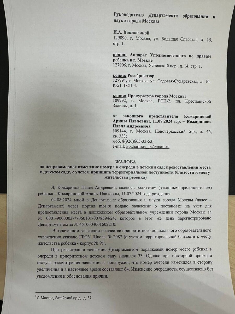 в ясельную группу. Заметил неприятную вещь, что при постановке заявления на учет в 2024 году при рождении, номер очереди был 33, а сейчас аж 64🤦♂️🤦♂️🤦♂️. Решил разобраться и заранее написать в Департамент образования и науки г.Москвы. Посмотрим что из этого выйдет. Будем ждать официальных письменных объяснений…Надеюсь получится немного расшевелить этот бюрократический аппарат🤭