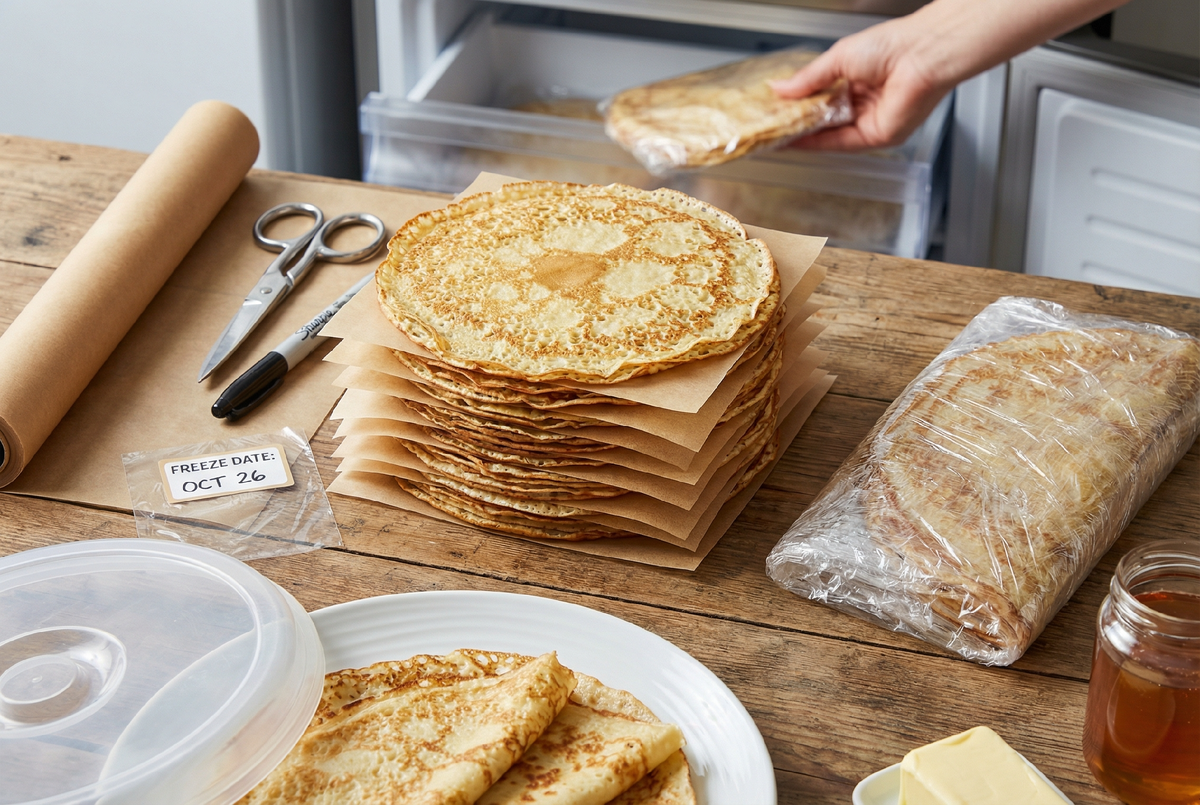 Я перепробовала разные варианты: пищевую пленку, фольгу, вощеную бумагу. Но лучше всего работает именно пергамент для выпечки. Он не прилипает к блинам, легко отделяется даже в замороженном виде, не рвется и не крошится. Пищевая пленка иногда примерзает к поверхности блина, особенно если на нем есть капельки влаги. Фольга работает неплохо, но она дороже пергамента и при разделении блинов может порваться острыми краями. А вощеная бумага просто не та текстура, она слишком скользкая, и стопка блинов постоянно разъезжается.