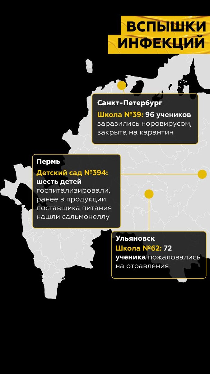 На карантин ушли как минимум ученики семи школ. С инфекцией госпитализировали 11 детей-инвалидов из реабилитационного центра «Радуга» в Алтайском крае. В больнице также оказались шестеро дошкольников из детсада № 394 в Перми Вспышки кишечных инфекций среди школьников появились в Сыктывкаре: там на карантин ушло сразу несколько школ. Почти 100 учеников заболели норовирусом в Петербурге — предположительно, после купания в школьном бассейне. Едой из столовой отравились школьники в Тюменской области: там заболело 116 учеников. Региональные ведомства провели проверки. Как нам рассказала вирусолог Лариса Попович, такая ситуация с заболеваниями — нестандартная: обычно вспышки кишечных инфекций происходят летом, так как дети едят больше фруктов, которые могут быть плохо промыты. Зимой таких заболеваний должно быть гораздо меньше. По словам эксперта, причины кишечных вирусов всегда одинаковые: некачественные продукты, грязные руки, антисанитария в пищеблоках и других помещениях. Как мы писал