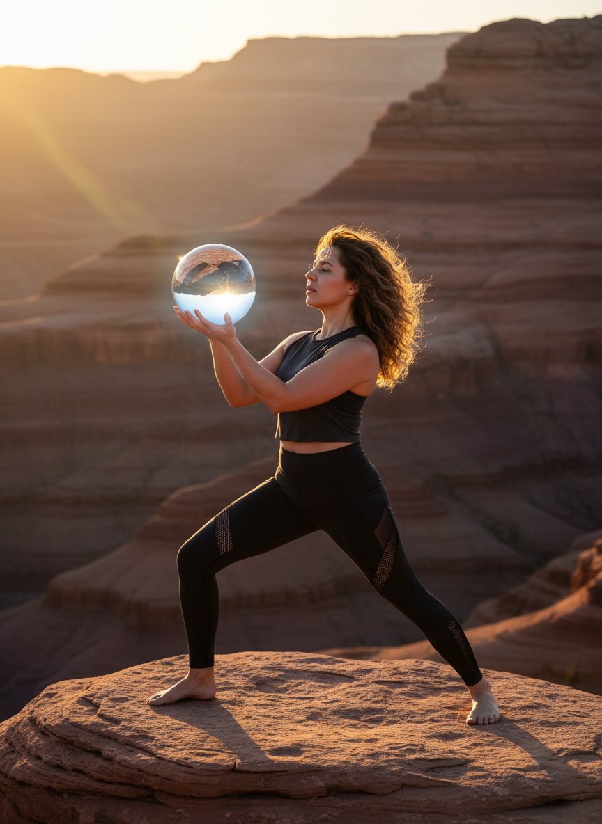 ** 🎨 Промпт: ** A dynamic portrait of the woman from the reference photo, her facial features and likeness identical. In a desert canyon at sunrise, she performs a defiant yoga pose on a sandstone ledge, gazing into a large crystal ball cradled in her hands. She wears edgy, dark-toned athleisure gear—a cropped tank top and high-waisted leggings with strategic mesh panels—set against rich autumn canyon walls. The scene uses telephoto compression to flatten the layers of orange and burgundy rock. Lighting is a mix of warm, directional golden hour sun and a cool, subtle glow emanating from within the crystal ball, creating a rebellious, charged atmosphere. --ar 3:4 --style raw Банк Промптов | Твои Идеи