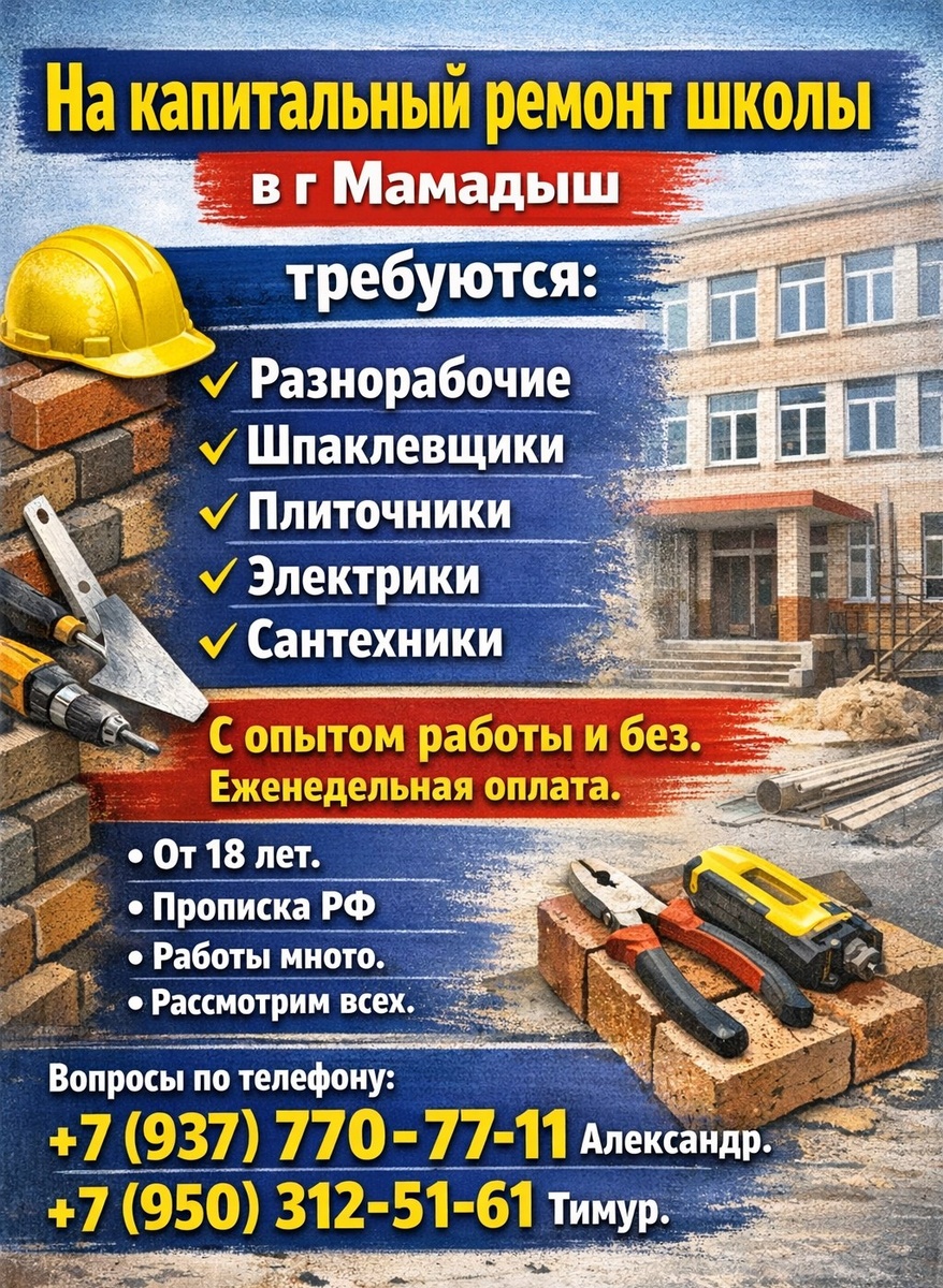 : . Разнорабочие . Шпаклевщики . Плиточники . Электрики . Сантехники С опытом работы и без Еженедельная оплата. От 18 лет. Прописка РФ Работы много. Рассмотрим всех. Вопросы по телефону +7 (937) 770-77-11 Александр +7 (950) 312-51-61 Тимур
