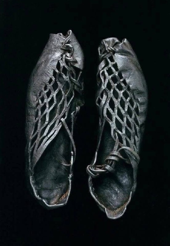Эту пару нашли на одном из болотных тел в Дании. В результате длительного пребывания в торфянике, на болотных телах сохранились кожаные элементы одежды и обуви, а на некоторых лицах можно разглядеть морщинки и щетину. Почему это поражает: Технология One-Piece: Туфли вырезаны из одного цельного куска телячьей кожи. Никаких швов на подошве, которые могли бы натирать или рваться. Сложная перфорация: Сетчатый узор — это не просто декор. Такая «вентиляция» позволяла обуви плотно облегать ногу, работая как современный эластичный кроссовок. Мастерство шнуровки: Кожаные ремешки переплетаются так, чтобы надежно фиксировать стопу. Это была статусная и очень удобная вещь для своего времени. Как они сохранились? Секрет в торфяных болотах. Особая кислая среда и отсутствие кислорода «законсервировали» кожу, превратив её в подобие дубленой, что позволило нам сегодня увидеть даже мельчайшие разрезы, сделанные древним мастером.