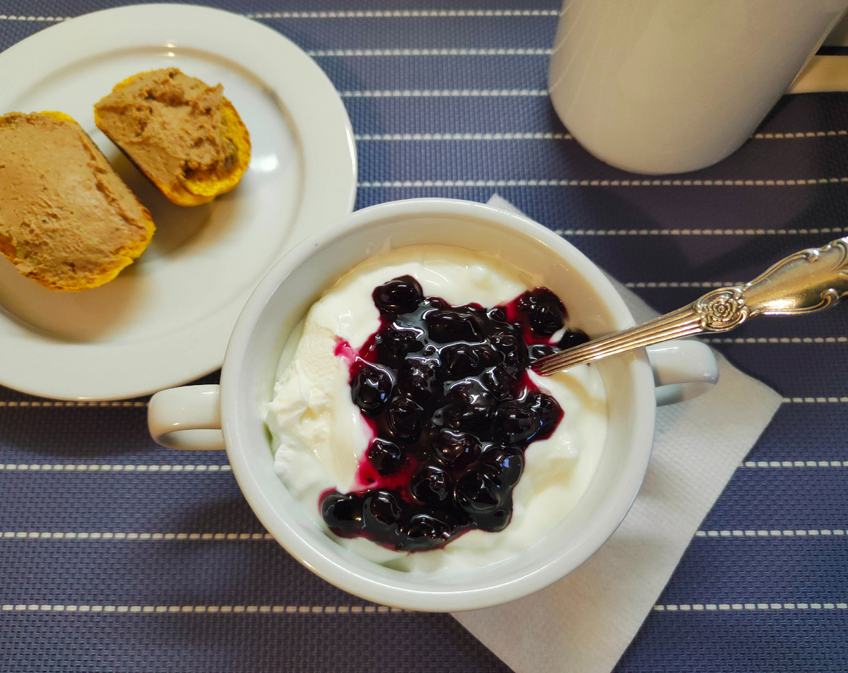 Домашний йогурт с вареньем из смородины; бутерброды с паштетом; кофе;