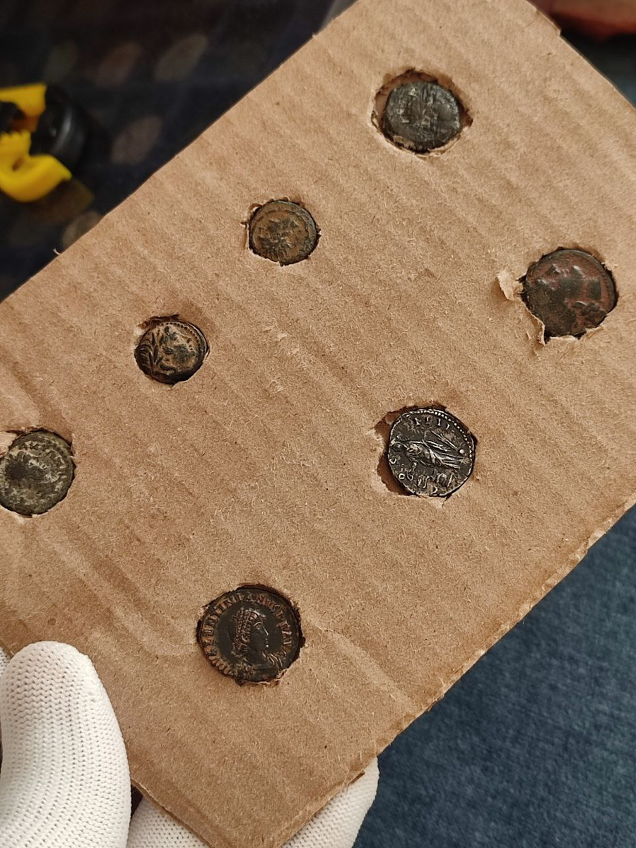 Первым достаю небольшой римский фоллис. Бронза, песчаная патина, 375-383 годы нашей эры. На аверсе - портрет императора Валентиниана II. Мальчишка, по сути. Ему было 4 года, когда армия провозгласила его августом.