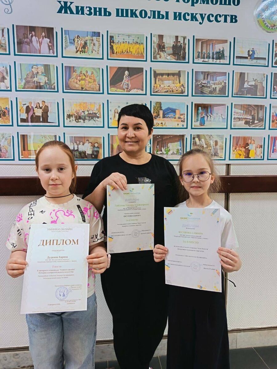 Обучающиеся Детской школы искусств Самира Юсупова и Карина Дудкина под руководством преподавателя Эльмеры Гайбатовой достойно представили своё учреждение на всероссийском уровне и пополнили копилку его наград новыми победами. Юные дарования приняли участие во Всероссийской олимпиаде «Оазис талантов», продемонстрировав высокий уровень подготовки и творческого мастерства. По итогам конкурсных испытаний Самира Юсупова удостоена диплома II степени в номинации «Декоративно-прикладное творчество». Карина Дудкина стала обладателем диплома I степени в олимпиаде «Умники онлайн» по истории изобразительного искусства. Высокую оценку получила и работа наставника: Эльмера Зульфакаровна Гайбатова отмечена дипломом за профессионализм и качественную подготовку участниц.