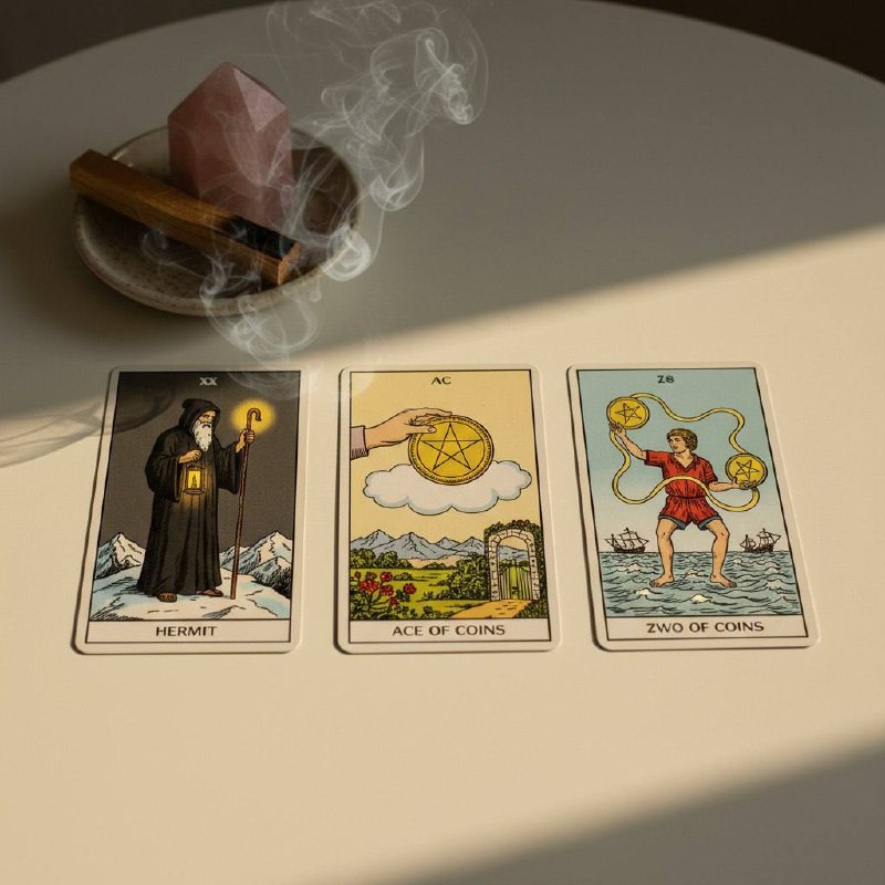 Хочу ввести рубрику с наглядными вопросами и ответами Таро, чтобы вы понимали, как это работает. Ответы иногда вообще не соответствуют ожиданиям, а три карты дают ясность и готовое решение. Итак, вопрос: – Будут ли у меня еще нормальные отношения дальше? Карты: Отшельник, Туз Пентаклей, Двойка Пентаклей. Клиентка два года в разводе. Есть ухажеры, но стабильных отношений нет. Естественно, если увидеть Отшельника в вопросе на отношения, кажется, что это «клеймо» или венец безбрачия на всю оставшуюся жизнь. Но это только если вы очень тревожная и читаете Таро по слогам. В совокупности с другими картами ответ очень даже обнадеживающий. Трактовка: 1. Отшельник Эта карта – не предвестник вечного одиночества, а скорее период осознанного самоанализа и внутреннего поиска, когда через прошлые уроки мы понимаем, что нам действительно нужно и ценно в жизни. То есть период, когда клиентка сама себе отвечает на вопрос: а что для нее «нормальные отношения» и готова ли она к ним по-настоящему?