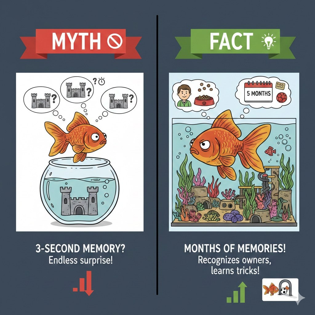 🐟📉🚫 Мем о том, что рыбка забывает всё, едва проплыв круг по аквариуму, оказался полной чепухой. 📉💡 Миф: память длится три секунды. Считается, что жизнь рыбки — это бесконечная серия удивлений от одного и того же замка. На самом деле их когнитивные способности гораздо выше. 🏰🐠 Факт: месяцы воспоминаний. Ученые доказали, что золотые рыбки помнят информацию до пяти месяцев. Они различают цвета, звуки и время кормления, собираясь у кормушки заранее. 🍲⏰ Распознавание лиц. Рыбы способны узнавать хозяев. Они ведут себя по-разному с близкими людьми и незнакомцами, что требует сложной работы мозга. 👤👀 📢 Рыб даже научили играть в «футбол» и проплывать через лабиринты за вознаграждение. Это полностью разрушает теорию о короткой памяти. Миф, скорее всего, выгоден продавцам тесных аквариумов: так людям проще оправдать содержание питомца в скучной банке. 💸🚫🐠