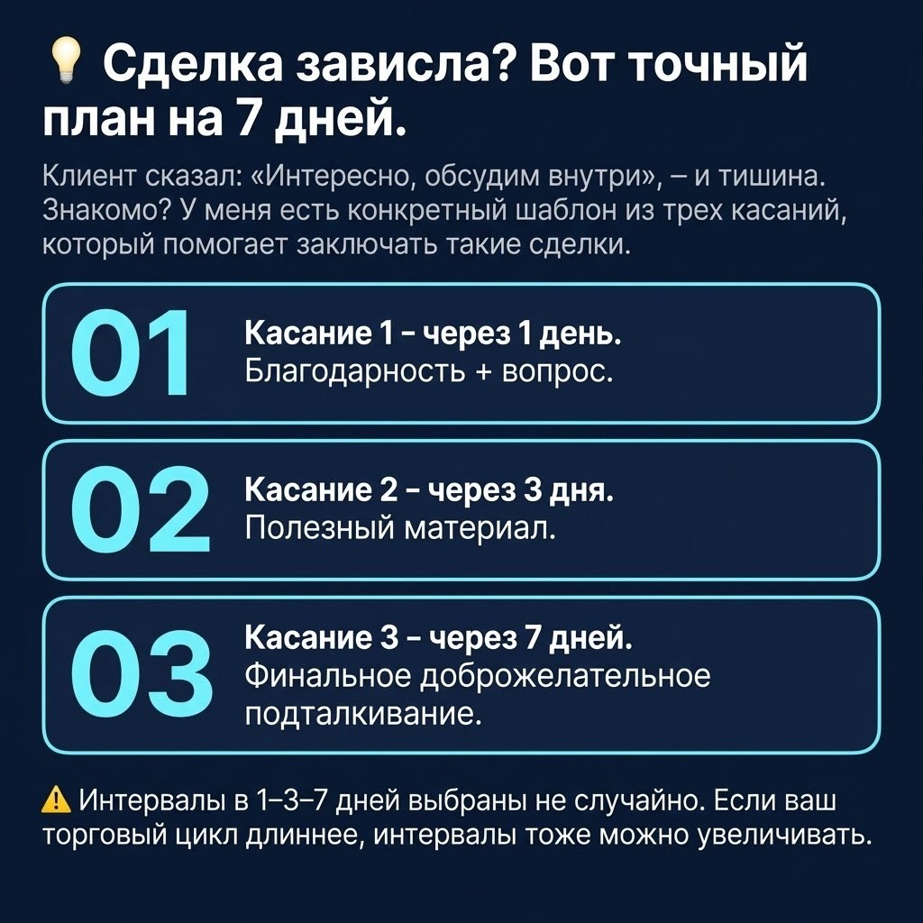 Клиент сказал: «Интересно, обсудим внутри», - и тишина. Знакомо? У меня есть конкретный шаблон из трех касаний, который помогает заключать такие сделки. 1️⃣ Касание 1 - через 1 день. Благодарность + вопрос. «[Имя], спасибо за продуктивный разговор! Хотел уточнить: все ли верно в присланном договоре, нет ли вопросов?» Вы мягко напоминаете о следующем шаге - без давления. Даже если клиент не просматривал договор, он напишет: «Пока не успел, посмотрю» - и тем самым возьмет на себя обязательство. 2️⃣ Касание 2 - через 3 дня. Полезный материал. «[Имя], я составил для вас небольшой план-график проекта на 3 месяца (прикрепляю). Он поможет лучше понять этапы. Если будут комментарии - обсудим!» Это не просто «ну что там?». Это реальная ценность. Человек видит, что вы потрудились, и чувствует, что нужно хотя бы ответить. 3️⃣ Касание 3 - через 7 дней. Финальное доброжелательное подталкивание. «[Имя], с нашего разговора прошла уже неделя. Если решение пока откладывается, просто скажите, я