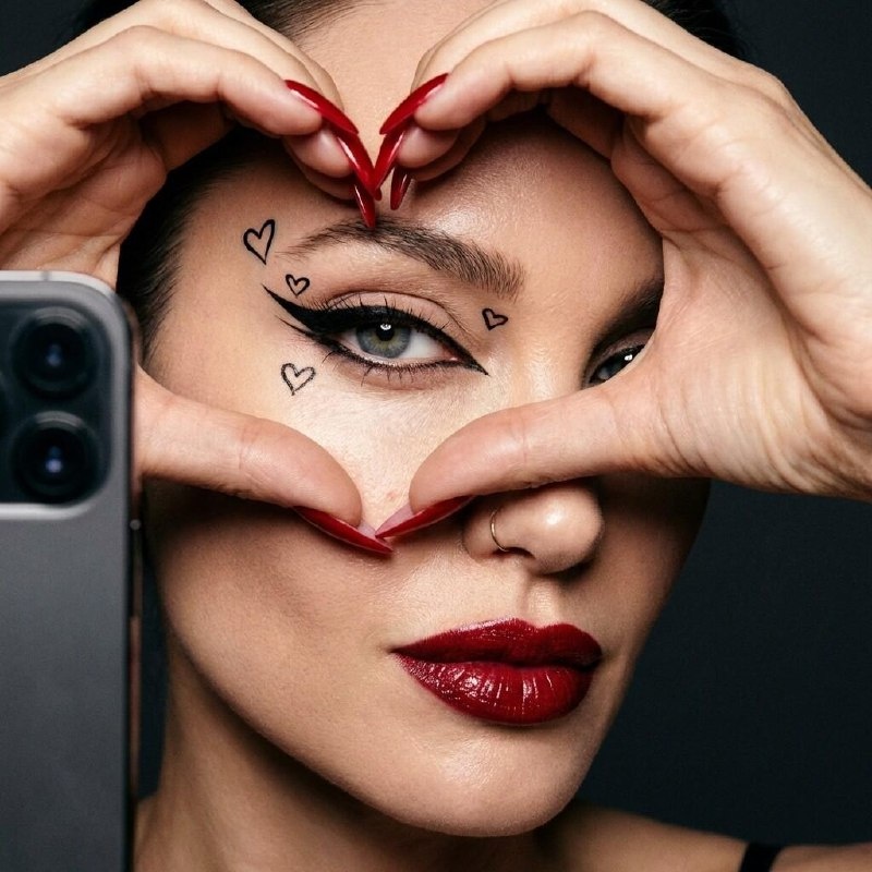 Модель: Nano Banana Сгенерировать🪄 Используй лицо девушки с загруженного фото. Селфи-портрет с ультракоротким прицелом на глаза, губы и руки, сделанный фронтальной камерой смартфона. Фотограф обводит один глаз обеими руками в форме сердечка, пальцы нежно соприкасаются, подчеркивая симметрию и интимность. Длинные, острые красные ногти миндалевидной формы доминируют на переднем плане, добавляя смелый, провокационный акцент. Макияж эффектный и графичный: насыщенная черная подводка для кошачьих глаз, подчеркнутая резкими стилизованными штрихами, маленькие сердечки, нарисованные от руки над и под глазами, и полные, идеально очерченные брови. Кожа выглядит гладкой и сияющей, с мягким атласным блеском, едва заметным выделением на скулах и переносице. Губы окрашены в глубокий глянцевый красный цвет, они идеально очерчены, выглядят роскошно и элегантно. Небольшой пирсинг в носу тонко улавливает свет, добавляя выразительности, но не нарушая элегантности. Зрительный контакт прямой и гипнотическ