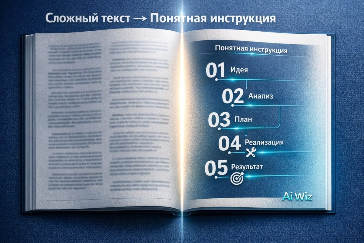 Прочитали статью на 15 страниц — получили много теории, но не поняли, что конкретно делать дальше. Классическая ситуация: материал полезный, но слишком академичный, без чёткой структуры действий. Или наоборот — статья написана для экспертов, а вам нужно объяснить это новичкам простыми словами и пошагово. Этот промпт нужен, когда есть сложный материал (статья, исследование, гайд), который нужно переупаковать в понятные инструкции для конкретной аудитории. Когда хотите не просто пересказать текст, а выстроить логичную последовательность действий: что делать первым, что вторым, какие инструменты использовать, на что обратить внимание. AI Wiz анализирует исходный материал, учитывает специфику аудитории (новички, эксперты, технически неграмотные) — создаёт структурированную инструкцию в нужном формате (текст, презентация, скрипт для видео). 🎯 Для кого это критично Образовательные проекты и онлайн-школы: 📍Превращаете научные статьи в понятные уроки для студентов 📍Адаптируете сложный