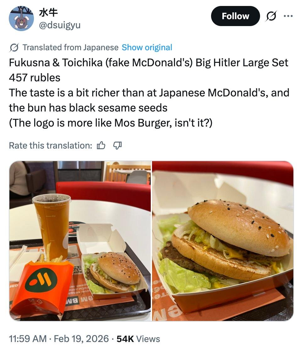 » Японский пользователь сообщил, что нейросеть Grok перевела название блюда «Биг Хит» как Big Hitler. Пользователь отметил, что комбо с этим бургером во «Вкусно — и точка» стоило 457 рублей и оказалось вкуснее, чем аналог в японском McDonald's. • Grok — нейросеть, разработанная компанией xAI. • Перевод вызвал обсуждение в соцсетях. https://dzen.ru/id/5c0e38ff46ef5c00aaa80527