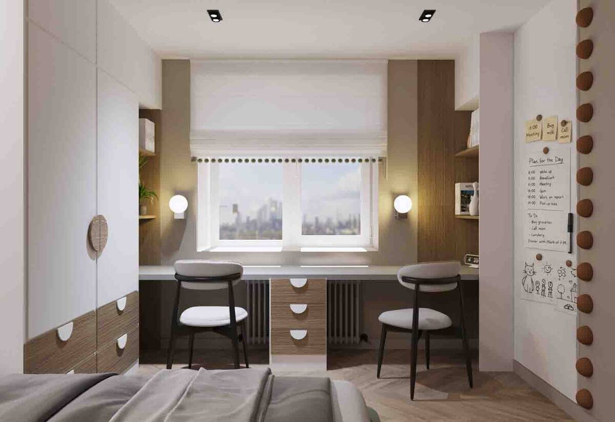 : Спальня 15 м2, в которой нужно комфортно разместить двух детей, это не самая простая задача даже для дизайнеров! 🔹Мы расположили два полноразмерных спальных места на одном уровне (хотя у меня были мысли о двухуровневой кровати), но дети близкие по возрасту и уже школьницы, поэтому решили пожертвовать пространством для игр но разместить удобно кровати. 🔹Шкаф для одежды с двумя секциями для хранения 🔹Большое рабочее место (длина столешницы 2,7 м) чтобы у каждого было место для учебы, с полками и ящиками для хранения. Вместо настольных ламп предусмотрели настенные светильники, чтобы не занимать место на столе. И конечно мы не забыли про розетки!😉 🔹Рядом со столом расположили магнитно-маркерную доску для заметок и творчества. Чтобы дети могли наглядно фиксировать свое расписание уроков и иметь место для творчества 🔹Большое зеркало, которое обязательно должно быть в спальне девочек☺️ 🔹Телевизор (к сожалению только один 😅) Хотел бы себе такую детскую?