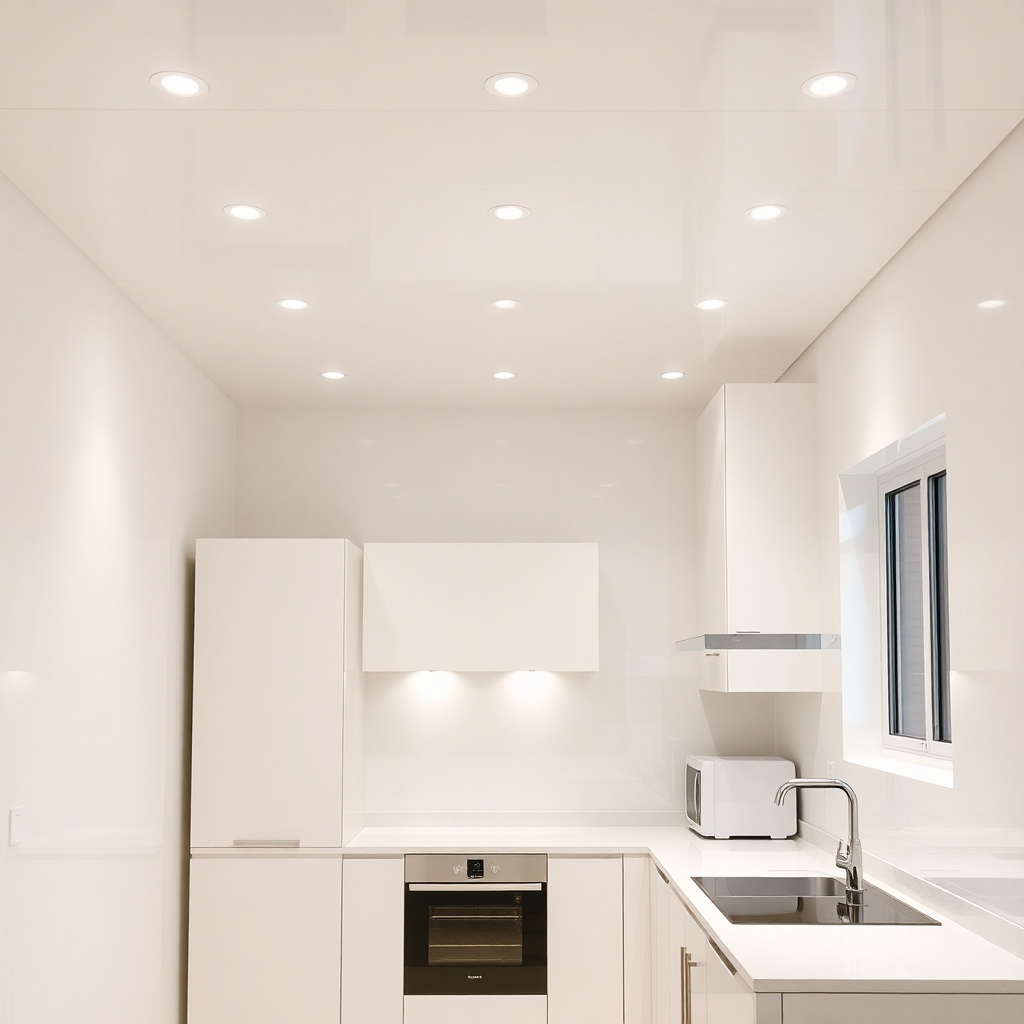 Переходим к натяжным потолкам, которые часто выбирают как потолок на кухне какой лучше в квартире. Полотно из тонкой пленки или ткани крепят на багет по периметру, предварительно прогрев комнату для эластичности. Установка проходит без пыли и мусора: мастера растягивают материал гарпуном, фиксируя полотна без видимых стыков на площадях до двадцати квадратных метров. Это решение полностью герметично, собирая конденсат внутри при протечке сверху, и маскирует все дефекты чердака или проводки. Глянцевая поверхность усиливает естественный свет, делая кухню ярче, но требует осторожности с острыми углами мебели. В уходе простота: достаточно протереть влажной губкой. Нюанс: для кухонь с детьми берите матовые варианты - на них меньше видны следы пальцев.