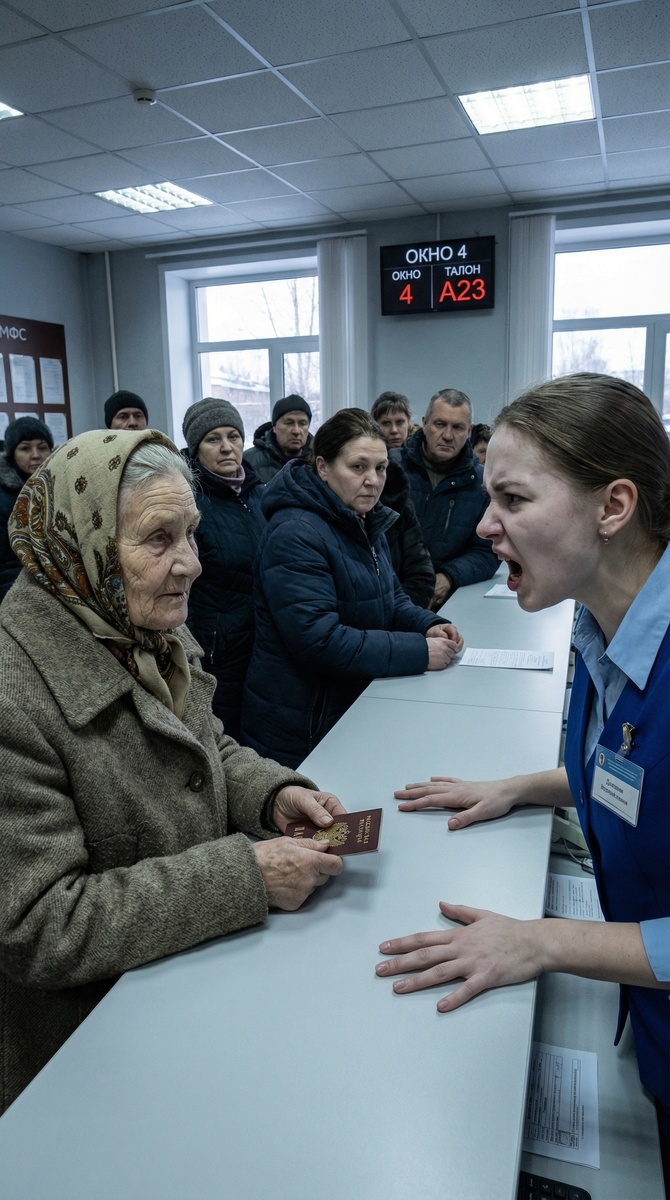 Очередь в МФЦ Нижнего Новгорода двигалась медленно. Женщина за стойкой — стриженая, с накладными ногтями и равнодушным взглядом — смотрела в монитор так, словно очередь снаружи её не касалась. Когда подошла пожилая женщина в сером пальто, сотрудница даже не подняла голову. — Следующий. Бабушка подошла, положила на стойку папку с документами. — Добрый день. Мне нужно… — Документы давайте. Чего мямлить. — Я хотела уточнить, какую форму заявления… — Там за углом терминал. Сами всё распечатаете. Или вы только в очередях стоять умеете? Бабушка спокойно поправила очки. — Я уже распечатала. — Тогда чего стоите? Давайте. Женщина в пальто раскрыла папку. Аккуратно, по одному, выложила листы. — Не торопитесь? — сказала она негромко. — Вы в МФЦ пришли или за пенсией стоять?! — громко, так что оглянулась половина зала. — Здесь очередь, у меня регламент! Встали на двадцать минут — и документы с ошибками принесли, небось. Бабушка ничего не ответила. Она молча достала последний лист. Сотрудница взяла