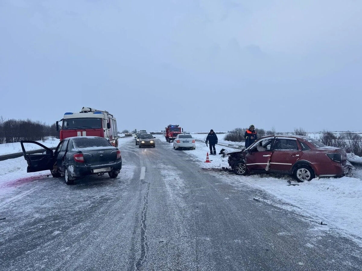 Первое ДТП произошло около 7:20 на 26 км Обхода г. Вологды. Как сообщили в региональном УМВД, 45-летний водитель чёрной «Лады Гранты» ехал со стороны Архангельска в сторону Москвы. Транспортное средство занесло и вынесло на полосу встречного движения. В результате произошло столкновение с красной «Ладой Грантой». В результате ДТП, по первичным данным, водитель 1980 года рождения получил перелом левого плеча, ушиб стопы и травму головы. Водитель второй лады, мужчина 1983 года — перелом бедра и травму головы, его пассажир, мужчина 1976 года рождения получил ушибы, имеется подозрение на травму головы, — сообщили в региональном УМВД. Вторая авария случилась на 20 километре этой же трассы около 7:33. По данным УМВД, 64-летний мужчина за рулём «Шевроле Ланос» тоже допустил занос автомобиля на встречную полосу, где столкнулся с грузовиком «Фотон». В результате водитель легковушки получил травмы, в том числе головы. Его без сознания доставили в больницу. Фото: УМВД России по Вологодской