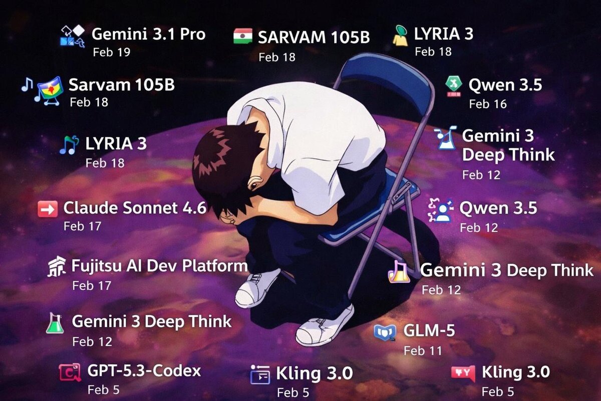 👇 19–20 февраля - Gemini 3.1 Pro** Улучшенное программирование, более сильные агенты, увеличенный контекст. 18 февраля - Google Lyria 3 Генерирует 30-секундные музыкальные треки с вокалом по тексту, изображениям или видео. 17 февраля - Strand-Rust-Coder-14B - модель, заточенная специально под генерациию Rust кода. 17 февраля - Claude Sonnet 4.6 Быстрая модель для программирования и сложного логического рассуждения. 17 февраля - Fujitsu AI Dev Platform Платформа, которая автоматизирует полный цикл разработки программного обеспечения. 16 февраля - Qwen 3.5 Более дешёвая и мощная модель с упором на агентные сценарии. 12 февраля - Gemini 3 Deep Think Создана для научных задач и сложных исследований. 12 февраля - MiniMax M2.5 Открытая модель с сильными возможностями в программировании. 12 февраля - Seedance 2.0 Реалистичное генеративное видео 1080p по тексту. 11 февраля - GLM-5 Крупная открытая модель с сильным логическим мышлением. 10 февраля - RynnBrain AI для робототехники и