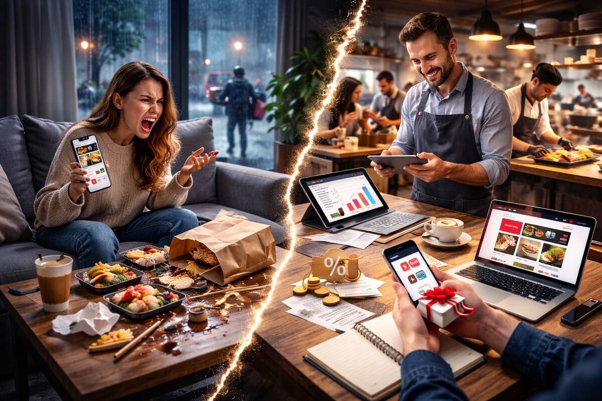 Но злитесь вы всё равно на ресторан. Почему? Мы живём во времена агрегаторов. Они забрали львиную долю рынка доставки, и теперь большинство не заказывает напрямую, как раньше. Но парадокс в другом: когда курьер опаздывает, в сумке всё перемешано, а чек вырос - злимся мы не на агрегатор. Мы злимся на ресторан, переставая там заказывать. При этом рестораны платят комиссиями по 20–35% с заказа и фактически жертвуют своей маржой, лишь бы их выбрали среди сотен карточек в приложении. Они тоже не в восторге. Это вынужденный союз. Вчера увидела рекламу одного популярного заведения. Логика следующая: эксклюзивные предложения и скидки только при заказе в их приложении. Ход стратегически верный: вернуть прямой трафик, сократить комиссии, усилить контроль над клиентским путём. Но есть нюанс. Люди устали устанавливать приложения. Покупая последний iPhone на последние кровные 💰, многие берут минимальный объём памяти. Поэтому любое новое приложение, занимающее мегабайты памяти - это не «удобс