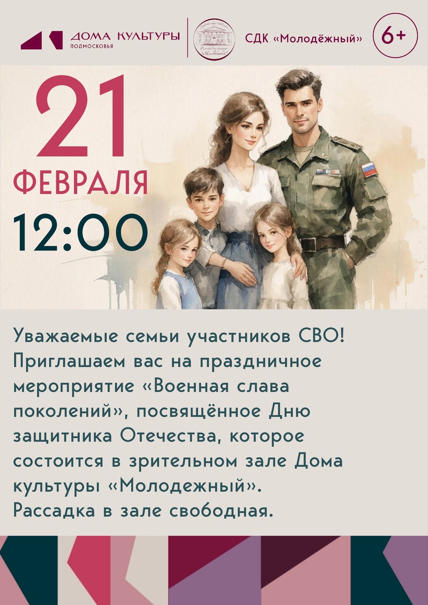 ✨ Праздничное мероприятие «Военная слава поколений» ❗❗❗Для членов семьи участников СВО. ✅ Мероприятие посвящённое Дню защитника Отечества состоится в зрительном зале дома культуры «Молодёжный». 🚫 Возраст: 0+ 📆 21.02.2026 🕒 12:00 🏢 СДК «Молодежный» 📍 г.о. Подольск, пос. Молодёжный, д.30 💰 Вход свободный❗️ ⭐Поддержать канал голосом 🍰Где поесть в Подольске ✅ Мероприятия Подольск https://dzen.ru/id/66ed500f7b5671493eca3fd6 http://vk.com/podolsk_events http://dzen.ru/podolsk_events