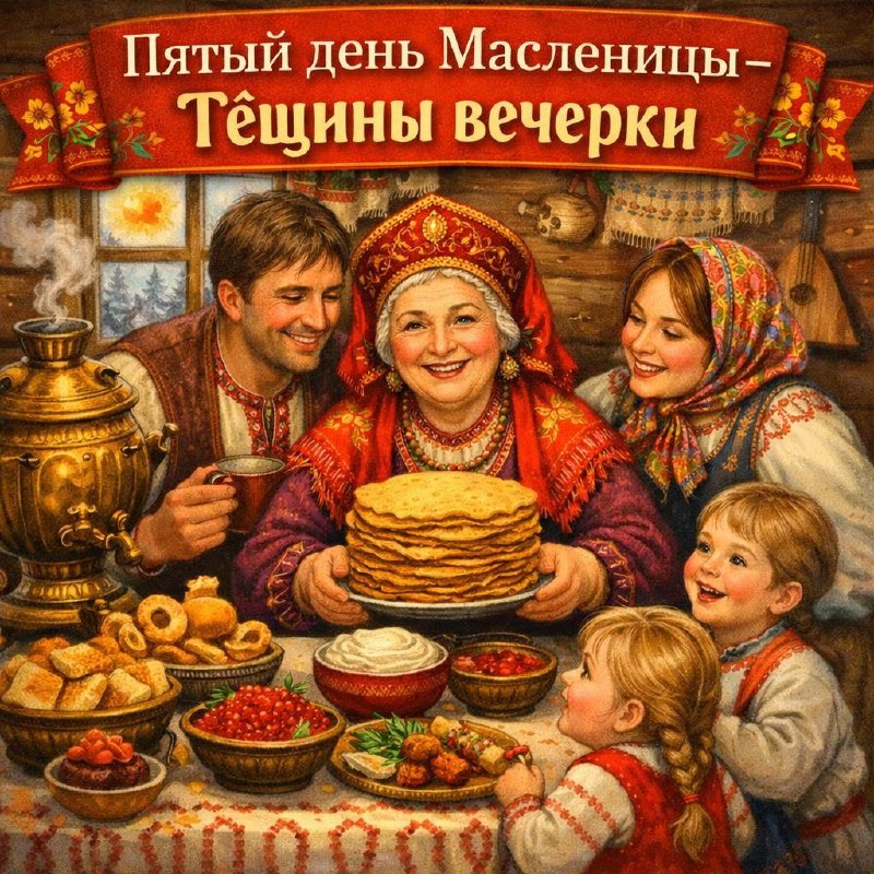 !»🌞 Ежедневно мы знакомим вас с обычаями каждого дня самой солнечной и блинной недели — Масленицы. Поехали! Масленичная неделя, или Масленица, — один из самых древних традиционных праздников на Руси. Его история уникальна, потому что началась она еще в далекие дохристианские времена. Праздник отмечали восточные славяне, связывая его с обрядами проводов зимы и встречей весны ⭐️День 5. 🥞Тещины вечерки 🪆Пятый день Масленицы называется «Тёщины вечерки». В этот день зять приглашал тёщу в гости и угощал её блинами — показывал уважение и расположение. Считалось, что чем щедрее стол, тем крепче будут отношения в семье. Это был своеобразный «ответный визит»: на третий день (Лакомка) тёща угощала зятя, а теперь очередь была за ним. 💛Интересный факт Если зять забывал пригласить тёщу или принимал её плохо, это могло стать поводом для долгих семейных обид. Поэтому к «Тёщиным вечеркам» готовились особенно тщательно — пекли лучшие блины и накрывали богатый стол. 🪆Мы поздравляем вас с М
