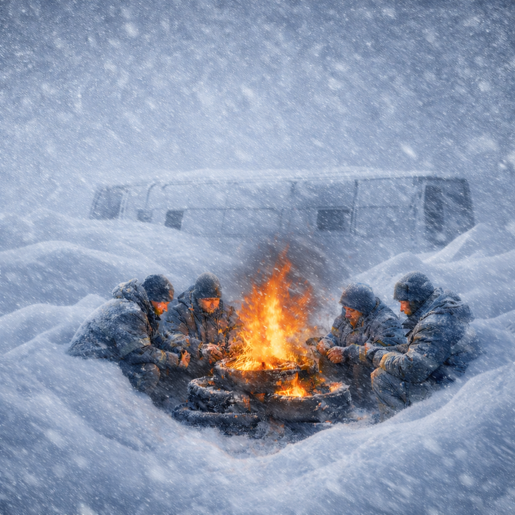 Белая мгла встретила шахтеров минимальной видимостью от горизонтально летящего снега.