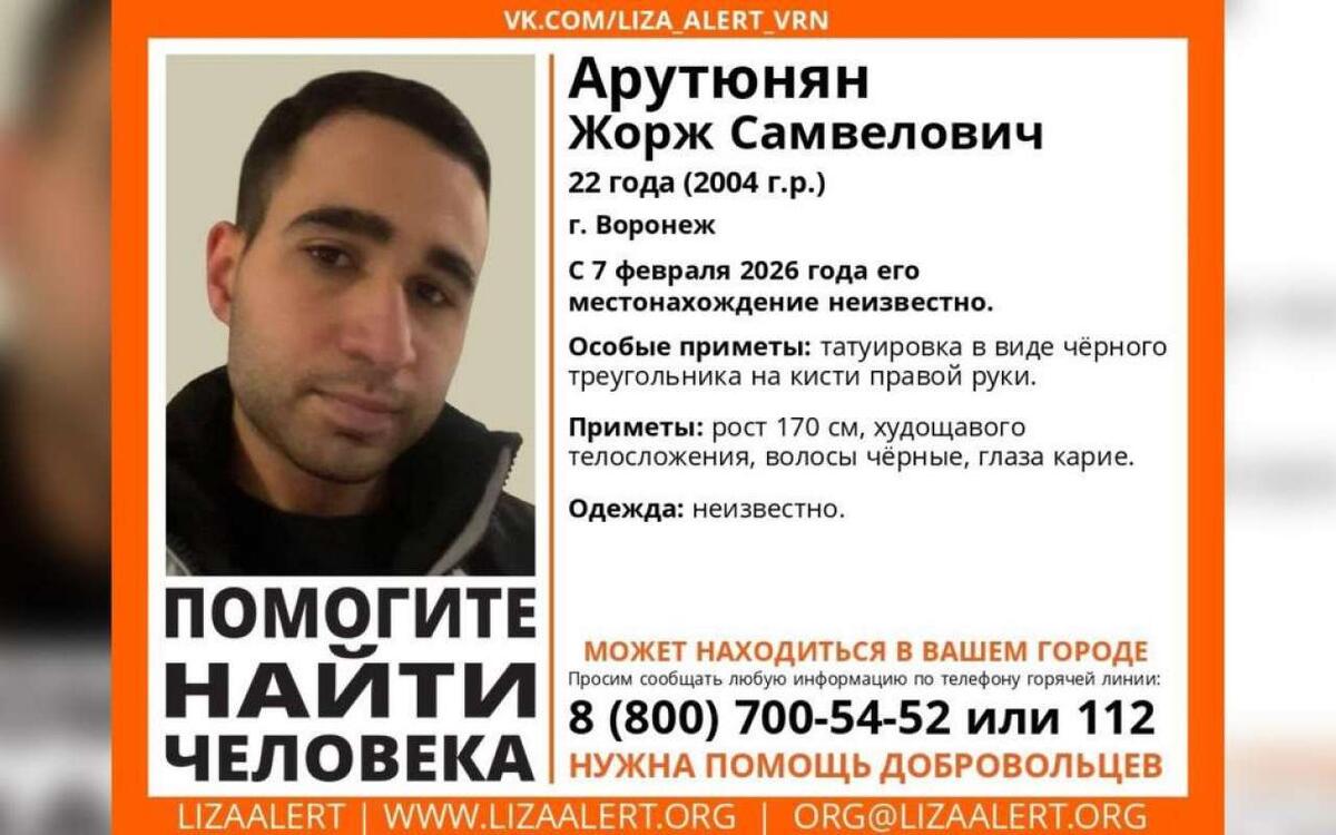 В Воронеже две недели назад без вести пропал 22-летний Жорж Арутюнян. Соответствующую информацию разместили волонтеры регионального поисково-спасательного отряда «ЛизаАлерт» в пятницу, 20 февраля. По информации активистов, 7 февраля парень вышел из дома в неизвестном направлении и не вернулся, перестав выходить на связь с родственниками. Приметы пропавшего: рост – 170 см, худощавое телосложение, черные волосы, карие глаза. Также у него есть татуировка на кисти правой руки в виде черного треугольника. Как был одет молодой человек в день исчезновения – неизвестно. Всех, кто обладает какой-либо информацией о Жорже Арутюняне, просят позвонить по телефонам 8 800 700 54 52 (волонтеры) или 112 (служба спасения).