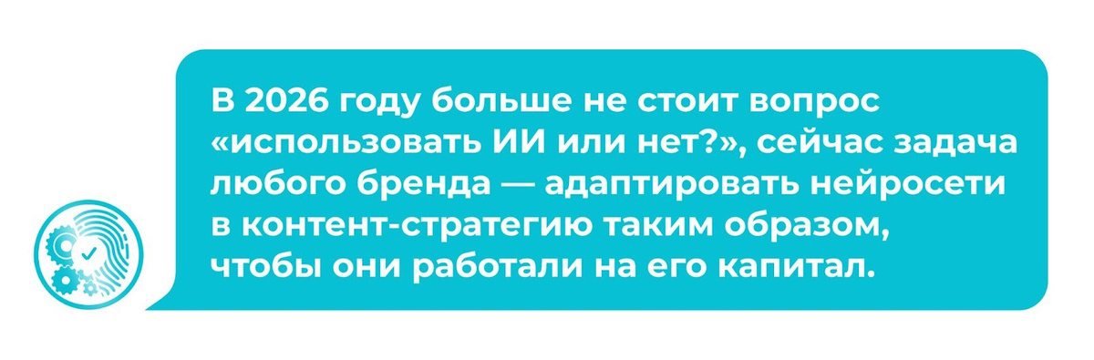 В 2026 году больше не стоит вопрос «использовать ИИ или нет», сейчас задача любого бренда — адаптировать нейросети в контент-стратегию таким образом, чтобы они работали на его капитал. Те, кто отдают все на откуп моделям, быстро оказываются в море однотипного контента. Выигрывают же те, кто учится говорить с помощью ИИ своим уникальным голосом.