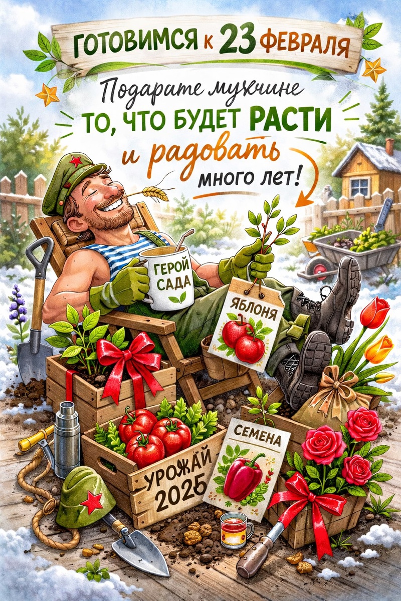?🪖 Не будем шутить про носки и пену для бритья, лучше предложим свои варианты: 🍎 плодовый саженец — чтобы было чем гордиться (посадил дерево, вырастил урожай - кормилец) 🌶 острый перец — для характера (да погорячее!) 🌲 хвойное — чтобы был стойким и вечнозеленым вечно молодым 🌹 или розу… если он романтик (такие тоже есть 😉) Серьёзно - мужчины любят практичные подарки. А что может быть практичнее растения, которое будет расти, цвести и плодоносить много лет? Тем более что у нас есть сюрприз...но о нем - позже🤫