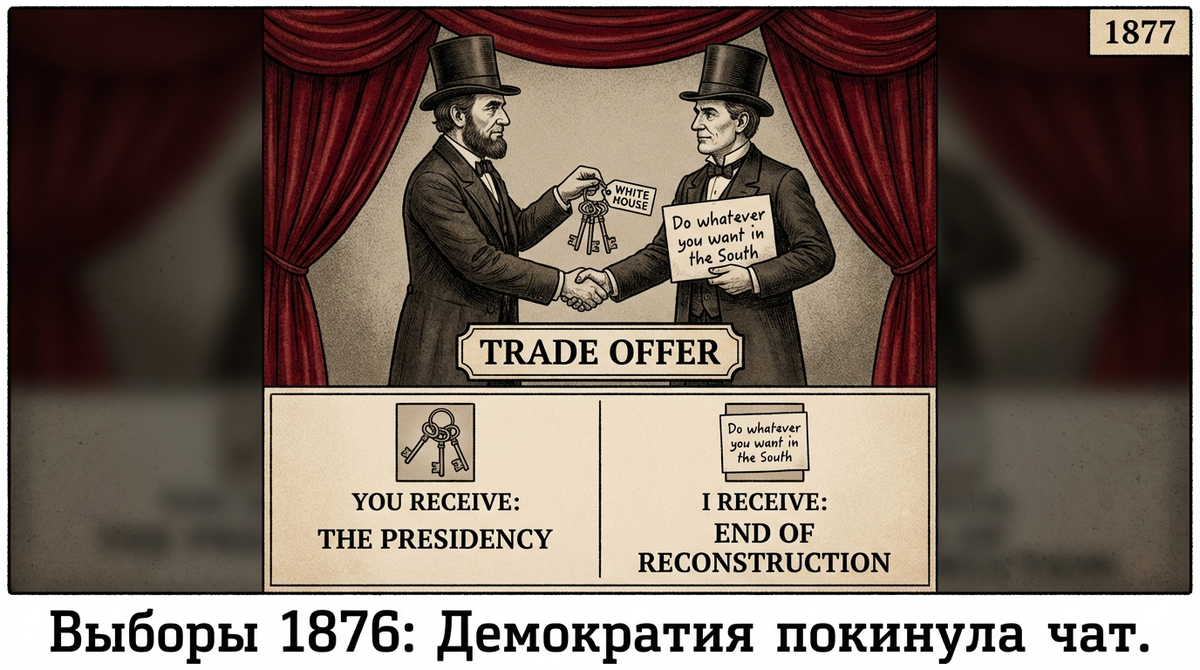 Гражданская война закончилась, рабов освободили. На Юге началась Реконструкция — северяне ввели туда войска, чтобы защищать чернокожих от бывших хозяев. Как только войска Севера ушли, южане придумали новую фишку — сегрегацию (Законы Джима Кроу). Армия США не могла победить индейцев в честном бою (те отлично знали местность). Тогда генерал Шеридан придумал подлый план: уничтожить их еду. Пока на Юге творилась дичь, Север делал бабки. США стали экономикой №1 в мире. В экономике появились гиганты — тресты (монополии). Политика США превратилась в бизнес. Работать по 12 часов на заводе Рокфеллера никому не нравилось. Когда коррупция достала всех, в дело вступили журналисты. США стало тесно на своем континенте. Они тоже захотели колоний. Президент Теодор Рузвельт был крутым мужиком. Внутри страны он жестко штрафовал монополии и защищал леса (создавал нацпарки). А вот во внешней политике он был хулиганом. ИТОГ: