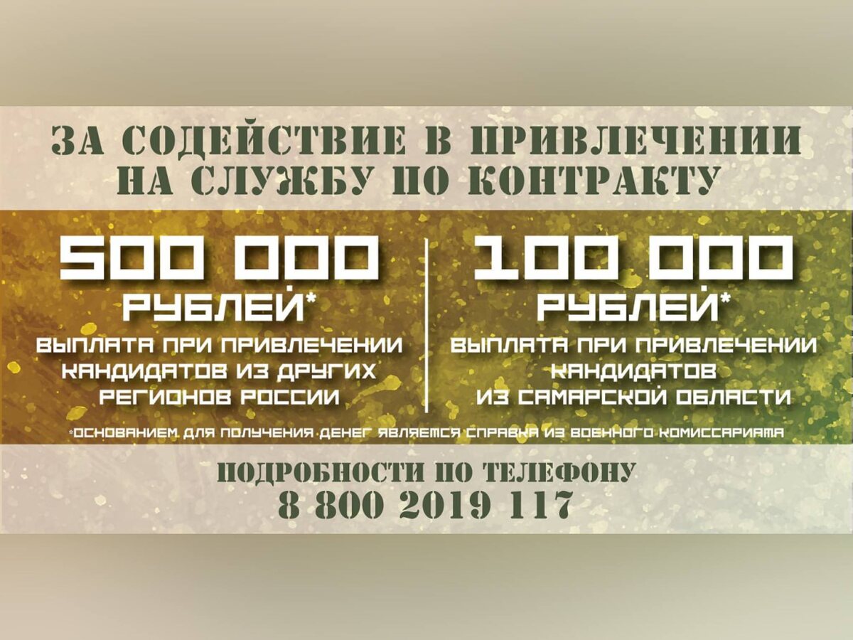 Выплату за информирование о преимуществах службы, помощь в прибытии в военный комиссариат или пункт отбора на службу по контракту сможет получить любой житель России. С 20 февраля она составляет 500 тыс. руб. при привлечении кандидатов из других регионов страны, 100 тыс.руб.при привлечении кандидатов из Самарской области. Основанием для получения денег является справка из военного комиссариата. Напомним, в Самарской области действует одна из самых высоких выплат в стране при заключении контракта с Министерством обороны РФ. Она составляет 2,6 млн руб. (вместе с федеральными средствами). Выплаты за первый год службы — более 5,1 млн руб.. Подробности можно узнать по телефону 8 (800) 2019 117 или в военном комиссариате по месту нахождения. 16+ Фото предоставлено правительством Самарской области Еще больше интересного на главной странице и в наших соцсетях: ВКонтакте, Telegram или Одноклассники.