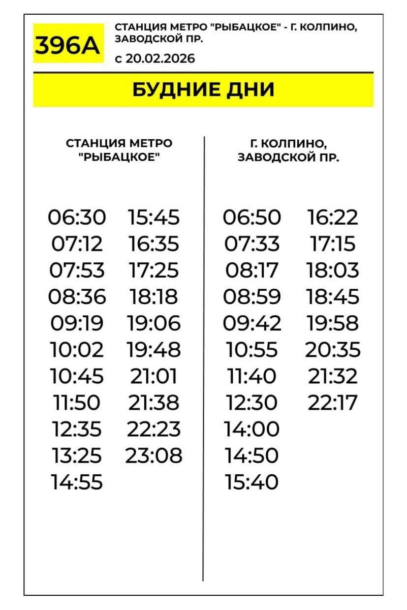🚌 С сегодняшнего дня маршрут №396А (м. Рыбацкое → г. Колпино) обновил расписание.