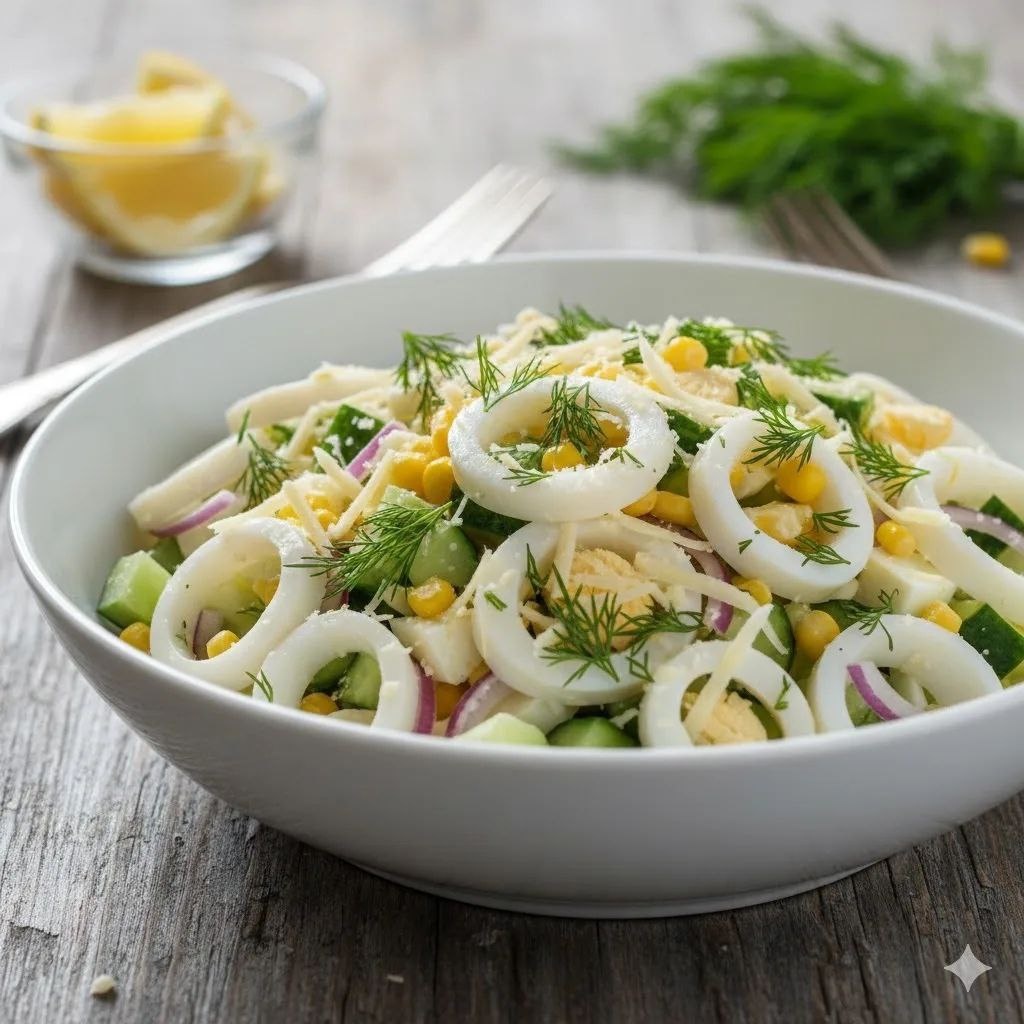 ❄️ ⏱15 минут | 140 ккал (100 г) 🛒Что нужно: 🦑 Кальмары (очищенные) — 300 г 🥚 Яйца вареные — 3 шт. 🥒 Огурец свежий — 1 шт. 🧅 Лук красный — 0,5 шт. 🧀 Сыр твердый — 50 г 🌽 Кукуруза консервированная — 100 г 🥣 Майонез или сметана — 2 ст.л. 🌿 Укроп свежий — для подачи 👩🍳Как готовить: Кальмары опустите в кипящую воду на 2 минуты, остудите и нарежьте тонкой соломкой. Яйца и огурец нарежьте кубиками, лук — мелкими перьями, а сыр натрите на мелкой терке. Смешайте все ингредиенты в глубокой миске, добавьте сладкую кукурузу. Заправьте салат соусом, перемешайте и украсьте веточками свежего укропа перед подачей. Вкусные Рецепты 😋