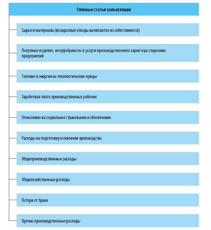 ? Состав статей калькуляции, методы их включения в себестоимость продукции, порядок оценки и учета незавершенного производства могут варьироваться в зависимости от отраслевых особенностей деятельности организации. Типовые статьи калькуляции перечислены на схеме.