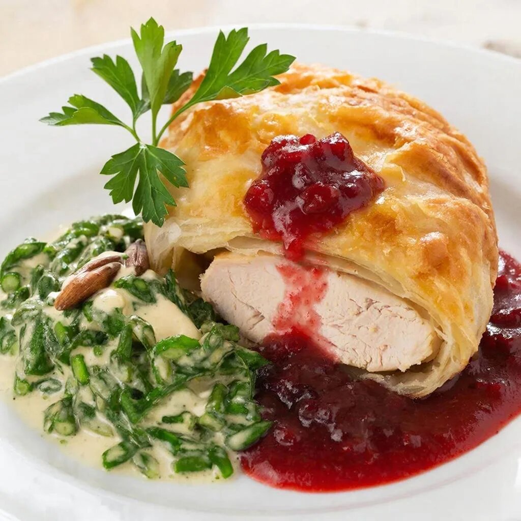 4. В центр положить 2 чайные ложки клюквенного соуса, сверху выложить мясо.