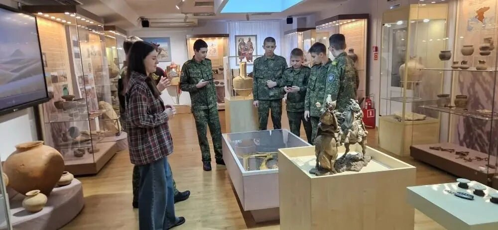 Волгодонский эколого-исторический музей посетила особая делегация — воспитанники Орловского казачьего кадетского корпуса. Визит состоялся сразу после знаменательной даты – 17 февраля, когда в России отмечается День кадета, символизирующий честь, достоинство и патриотизм молодого поколения, выбравшего путь служения Отечеству. Орловские кадеты — давние друзья музея, активные участники его конференций и патриотических проектов. В этот раз их знакомство с прошлым приняло форму живого диалога с эпохами. Особое внимание было уделено двум фундаментальным экспозициям. Первая — «Археологические памятники восточного региона Ростовской области» — перенесла ребят в глубины «Дикого поля». Они увидели артефакты, рассказывающие о древних курганах и народах, некогда населявших эти степи. Для многих стало открытием богатство и сложность истории, которая начиналась задолго до появления здесь казачьих станиц. Вторая экспозиция — «Территория I и II Донских округов Области Войска Донского (XVI — начало XX