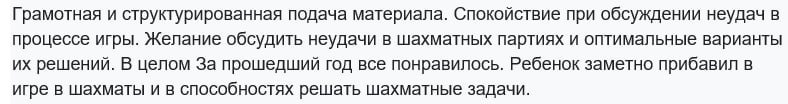 3️⃣ Миша запомнил алгоритм выбора хода и "гроссмейстерскую паузу" По сути он во многом аналогичен алгоритму принятия решений в менеджменте. А «гроссмейстерская пауза» - термин, который используют в повседневной жизни, чтобы обозначить взвешенность, продуманность решения. Важно, что алгоритм принятия решений при помощи шахмат превращается в навык. Он будет включаться автоматически в различных жизненных ситуациях. 4️⃣ Шахматы стали общим языком с папой. Они стали больше общаться. Отец написал отзыв (внизу поста)👇 Очень приятно, когда видишь воочию, как ребенок начинает понимать то, о чем раньше не догадывался. В сентябре парень пошел в школу. Жизнь, в том числе шахматная, - продолжается. Уверен, у Миши впереди много побед. И не только за доской. Ибо шахматы приучили его брать нашу "гроссмейстерскую паузу" перед тем, как сделать важный шаг. 💡Этот навык, - вовремя подумать, - станет его надёжным подспорьем и за школьной партой, и в жизни!
