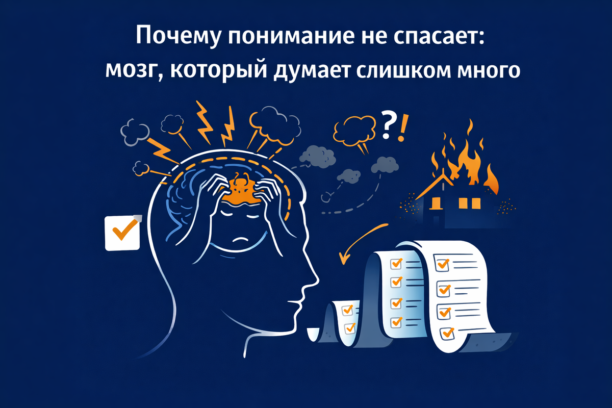 Вы уже знаете: И всё равно иногда лежите ночью и прокручиваете разговор пятилетней давности. Знакомо? Вот здесь начинается интересное. Потому что тревога — это не отсутствие знаний.