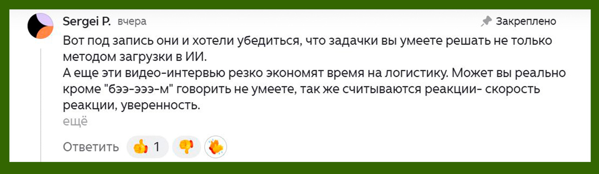 Помните, я писала про тестовое задание, которое загнала в чат GPT? Впрочем, я их всегда туда загоняю – те, которые с расчетами и определениями. Даже не вникаю, честно говоря. Это было здесь: Тем более, там была «Акула НR», но тогда я еще не знала, кто это такая. Специфика «акул» и подобных – сбор видео-базы, для своих коммерческих целей: В комменты под ту статью, с тестовым, пришел Сергей (который тоже ничего не знал про акул) и выдал следующее: Зачем «светить лицом» в Зуме, если работа удаленная, а в тестовом требуют посчитать формулы? Сергей, очнитесь. Какая, на_фиг, «скорость реакции»? Я что, пилот истребителя? Или сапeр на миnnом поле? Мы говорим про цифры. Про таблицы. Про формулы. Моя задача — выдать верный результат расчета. Точный. Безошибочный. Если я буду смотреть в камеру орлом и улыбаться во все 32 зуба, маржинальность в таблице сама собой вырастет? Или убыток превратится в прибыль от моей харизмы? Мы работаем в переписке, в мессенджерах, в документах. Мой голос — это т