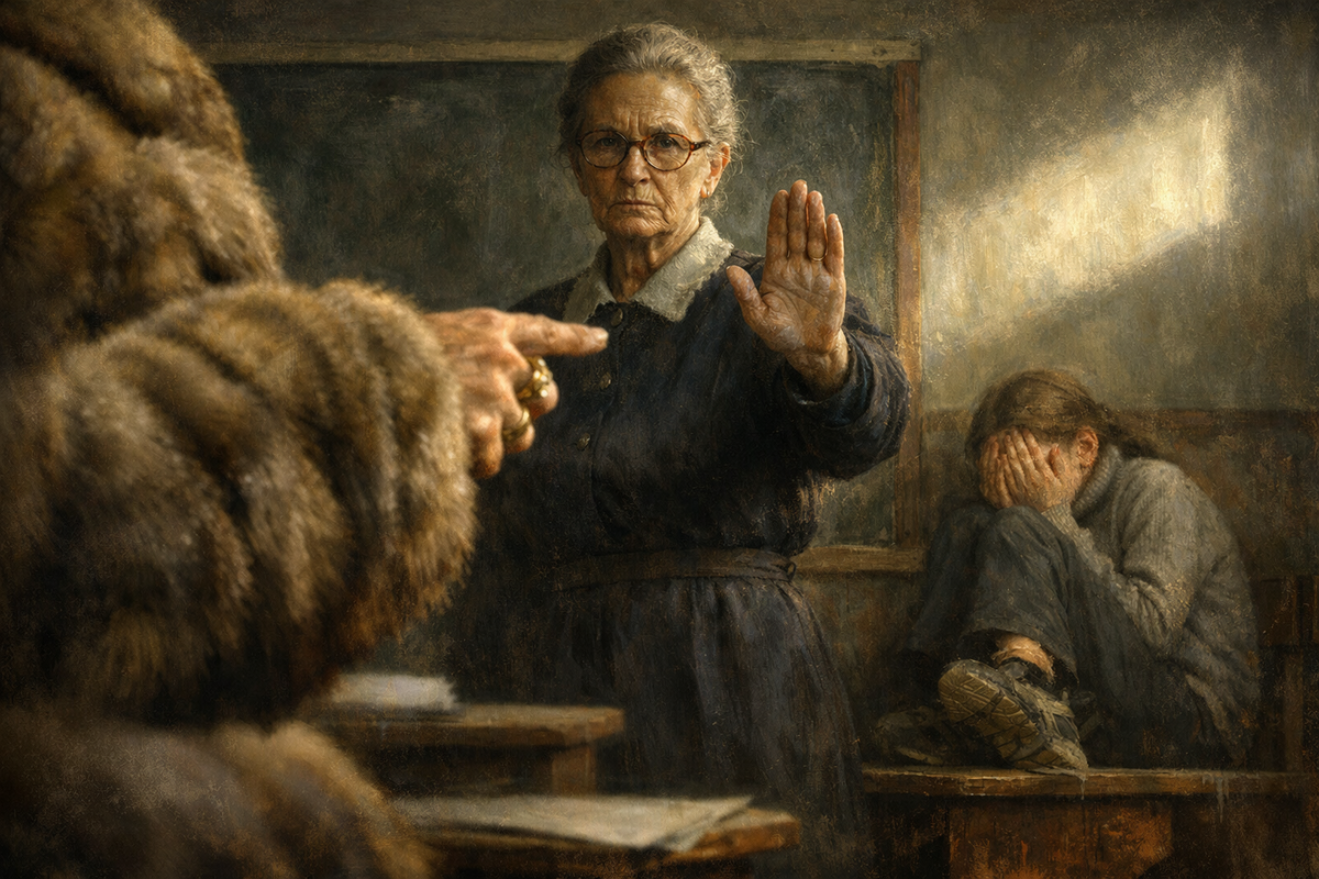 В класс вплыла не женщина — вплыла буря. Лариса Петровна, мама Виктории, в распахнутой шубе, похожей на шкуру разжиревшего зверя, заполняла собой всё пространство. За ней, семеня и стараясь не отставать, следовал директор школы, Николай Иванович — человек с лицом усталым и серым, как его пиджак, привыкший тушить пожары, не разбираясь в причинах возгорания.