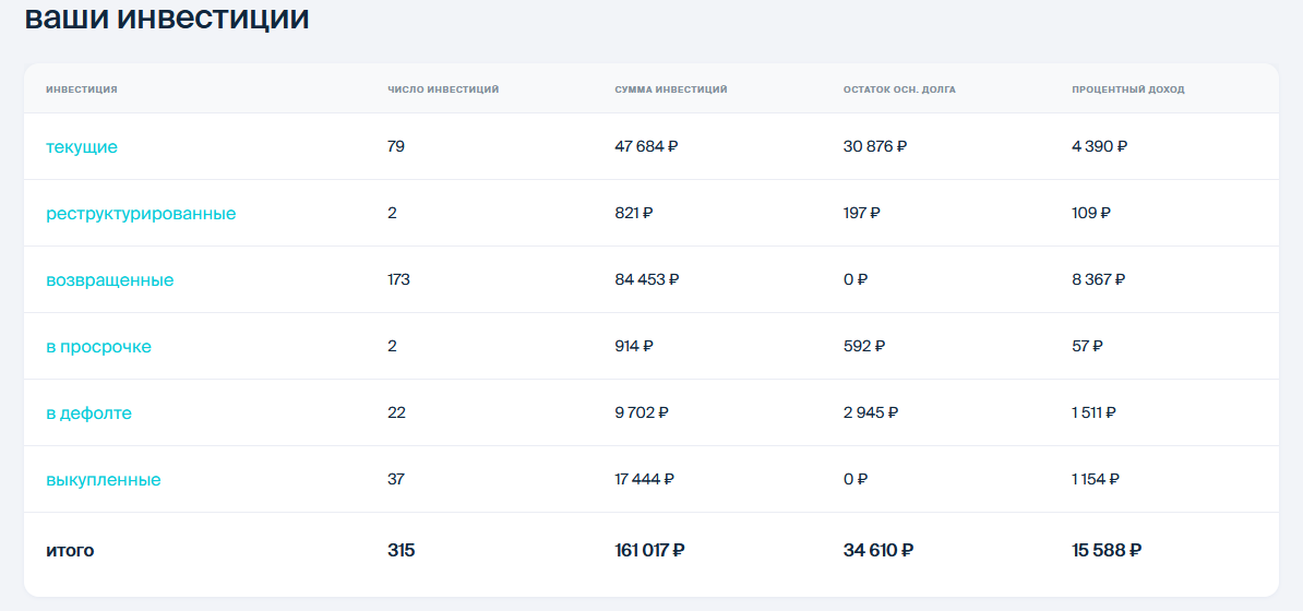 Конечно рано делать какие-то выводы, что все хорошо. Но все не так плохо, чтобы я начала выводить деньги. Тем более, что именно на этой платформе я могу продать займы только с дисконтом, а мне это не интересно в текущей ситуации. Вот если бы я переживала, то может и продала бы. И собственно если будет какая-то акция с начислением кэшбэка за пополнение счета, я может еще довнесу денег.