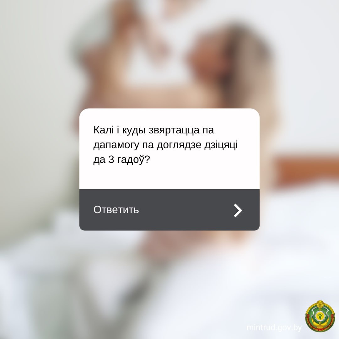 Калі і куды звяртацца па дапамогу па доглядзе дзіцяці да 3 гадоў 👛Памеры: ✅на першае дзіця –1000,86 руб. ✅на другое і наступных дзяцей –1143,84 руб. ✅на дзіця-інваліда – 1286,82 руб. ➡️Калі звяртацца ▪️не пазней за 6 месяцаў з дня, наступнага за днём сканчэння перыяду бальнічнага па цяжарнасці і родах – калі выплачана дапамога па цяжарнасці і родах. ▪️не пазней за 6 месяцаў з дня нараджэння (ўсынаўлення) дзіцяці (устанаўлення апекі) – калі дапамога па цяжарнасці і родах не выплачвалася. Калі дакументы прадстаўлены праз 6 месяцаў, дапамога прызначаецца з дня звароту за ёю. ➡️З якой даты прызначаецца ▪️з дня, наступнага за днём сканчэння перыяду выплаты дапамогі па цяжарнасці і родах ▪️з дня нараджэння (ўсынаўлення) дзіцяці (устанаўлення апекі) – калі не выплачвалася дапамога па цяжарнасці і родах ➡️Куды звяртацца па прызначэнне ▪️па месцы працы, службы, вучобы, клінічнай ардынатуры маці (мачахі) ў поўнай сям'і, бацькі ў няпоўнай сям'і, усынавіцеля, апекуна ▪️калі ў поўнай сям'і мац