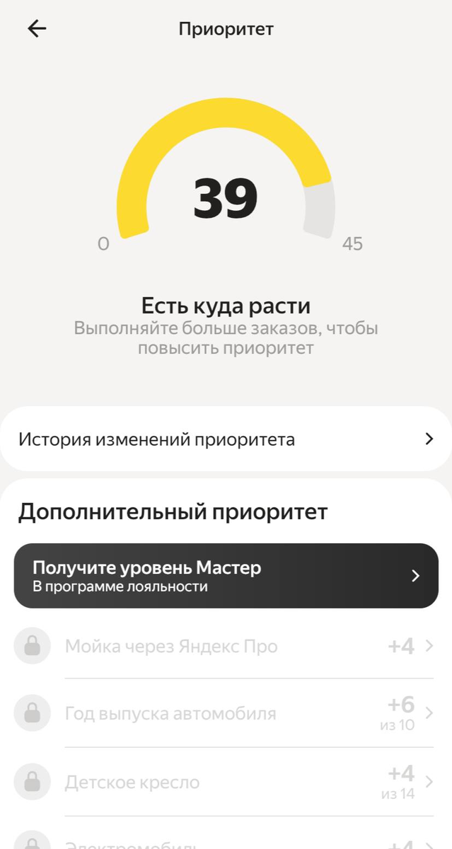Приоритет - это внутренняя метрика системы. Её вы не видите напрямую, но она определяет, кому достанется следующий заказ, если рядом стоят три водителя. Высокий приоритет = заказы идут к вам. Низкий приоритет = вы смотрите, как другие едут, а вы стоите.