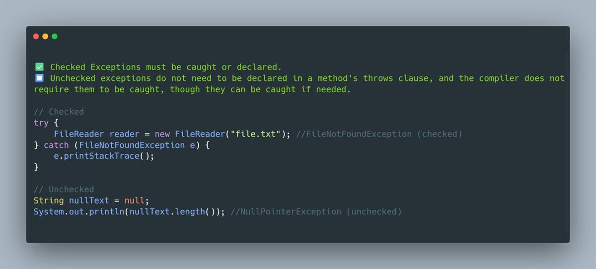 ✅ Checked exceptions (проверяемые) - компилятор *заставляет* обработать их - нужно либо try/catch, либо throws в сигнатуре метода - пример: FileNotFoundException, IOException ⚠️ Unchecked exceptions (непроверяемые) - компилятор *не требует* обработки - чаще всего это ошибки логики в коде - пример: NullPointerException, IllegalArgumentException, IndexOutOfBoundsException Запомни правило: **Checked = “предвидимая проблема” (например, файл не найден). Unchecked = “косяк в коде” (например, null, неправильный индекс).** @javarush
