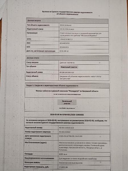 Название: Земельный участок с кадастровым номером 40:16:130100:423 площадь 1285 по адресу Калужская область, Мосальский р-н, д