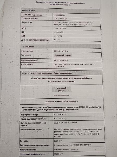Название: Земельный участок с кадастровым номером 40:16:130100:426 площадь 1296 по адресу Калужская область, Мосальский район, д