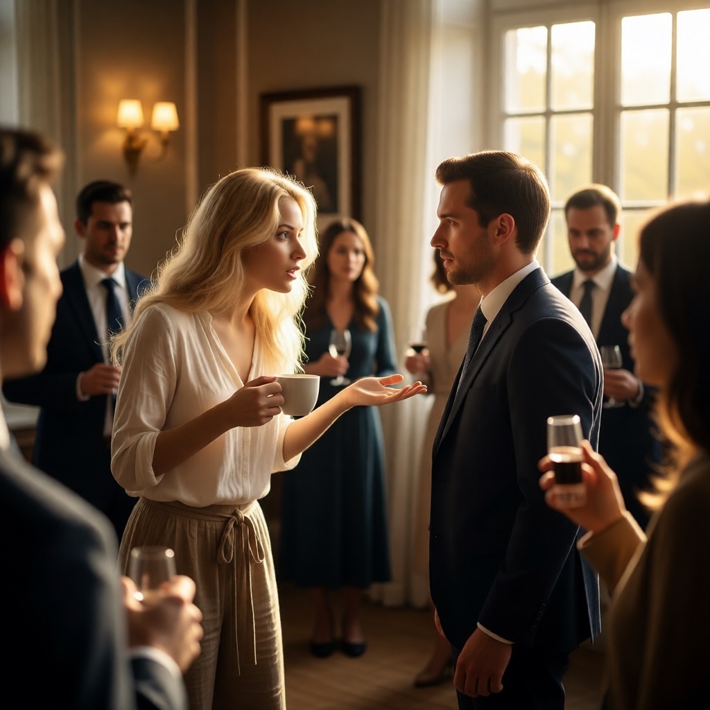 В комнате повисла тишина. Гости перестали разговаривать и обернулись к ним. Михаил замер с поднятым бокалом, удивлённо глядя на жену. Кто‑то из гостей нечаянно опрокинул бокал — звон стекла только подчеркнул наступившую тишину.
