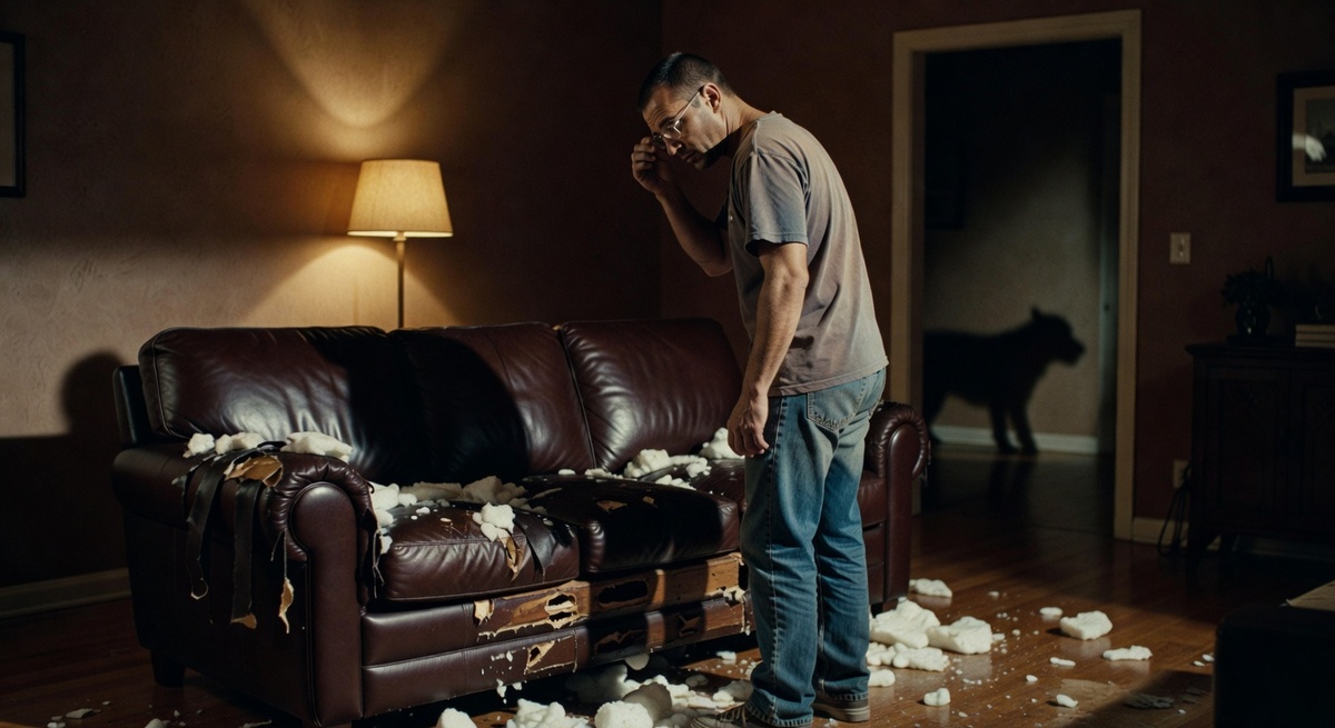 Я сидел в кресле напротив дивана. Диван — правый подлокотник уничтожен, кожа свисает, поролон клочьями на полу, деревянный каркас в следах зубов. Я не убирал. Специально.